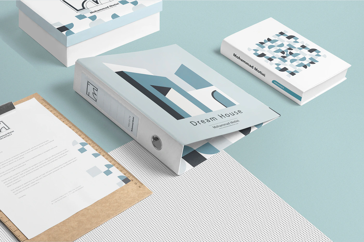 در کنار لوگو و رنگها، با الگو گرفتن از فرمهای هندسی، المانهای بصری برند را طراحی کردیم که در بستهبندی، اسناد پروژه، دفترچهها، و ابزارهای پرزنتیشن مورد استفاده قرار میگیرند و هویت برند را در حرکت، نظم و تکرار معنا میکنند.