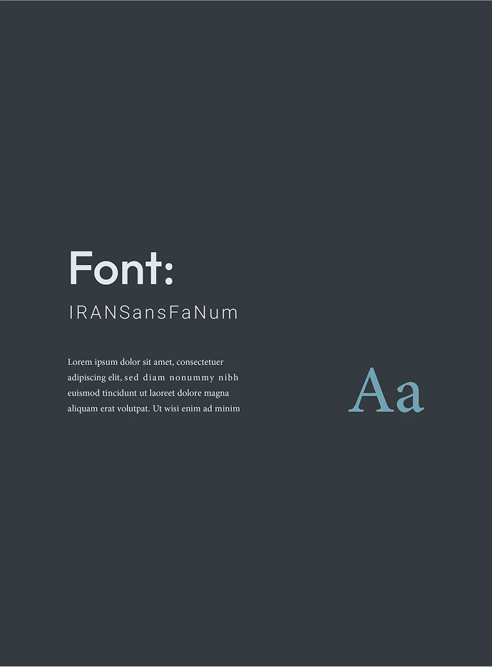 رنگهای برند را، بر پایه ترکیبی از آبی خاکستری، خاکستری تیره و خاکستری روشن انتخاب کردیم. رنگ آبی خاکستری، حسی از اعتماد، خلوص و خنکی فضاهای معمارانه را منتقل میکند. رنگهای خنثی تیره و روشن، نقش زمین و آسمان را بازی میکنند و بستر و پسزمینهای برای نمایش ایدهها هستند.